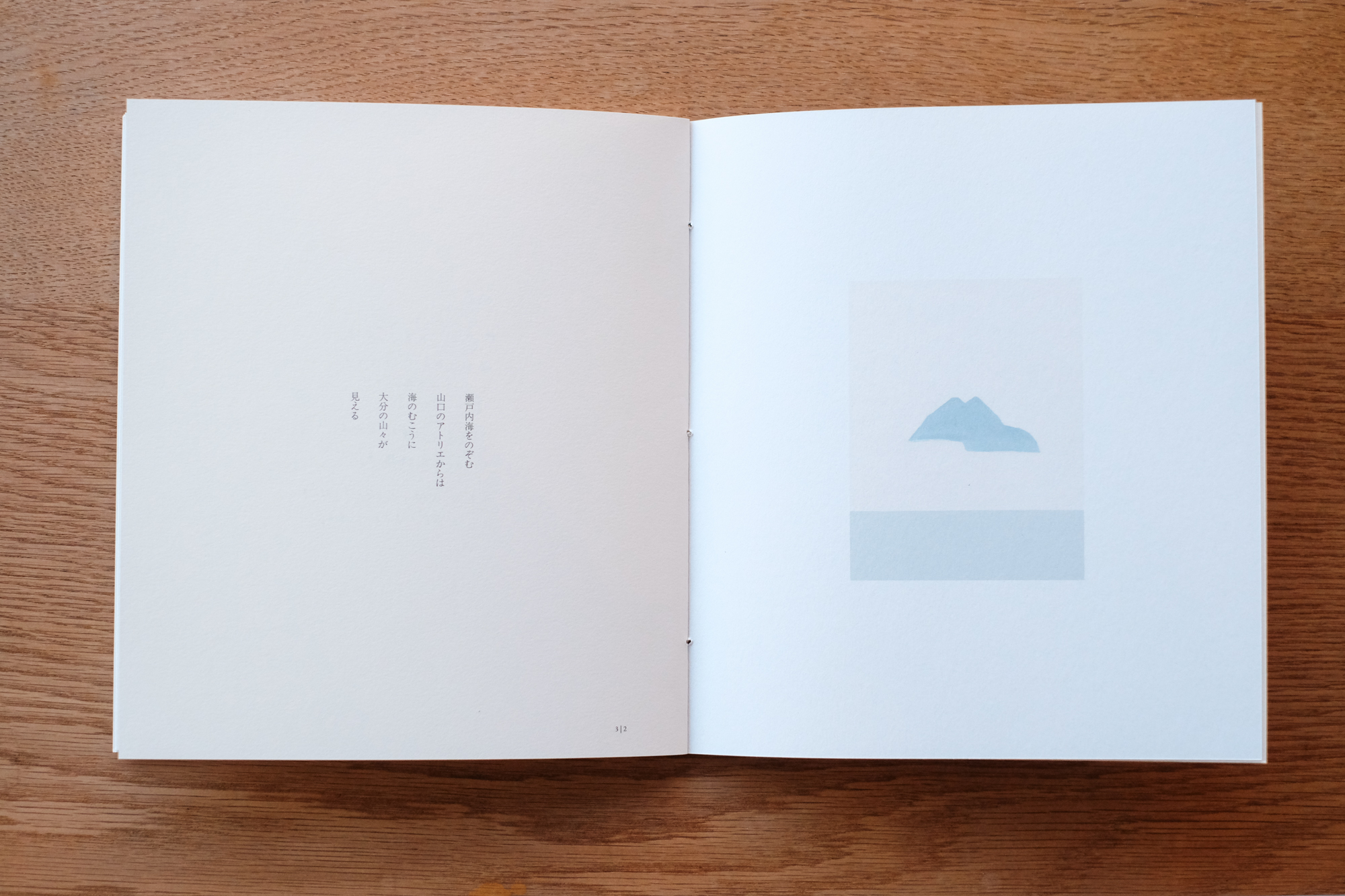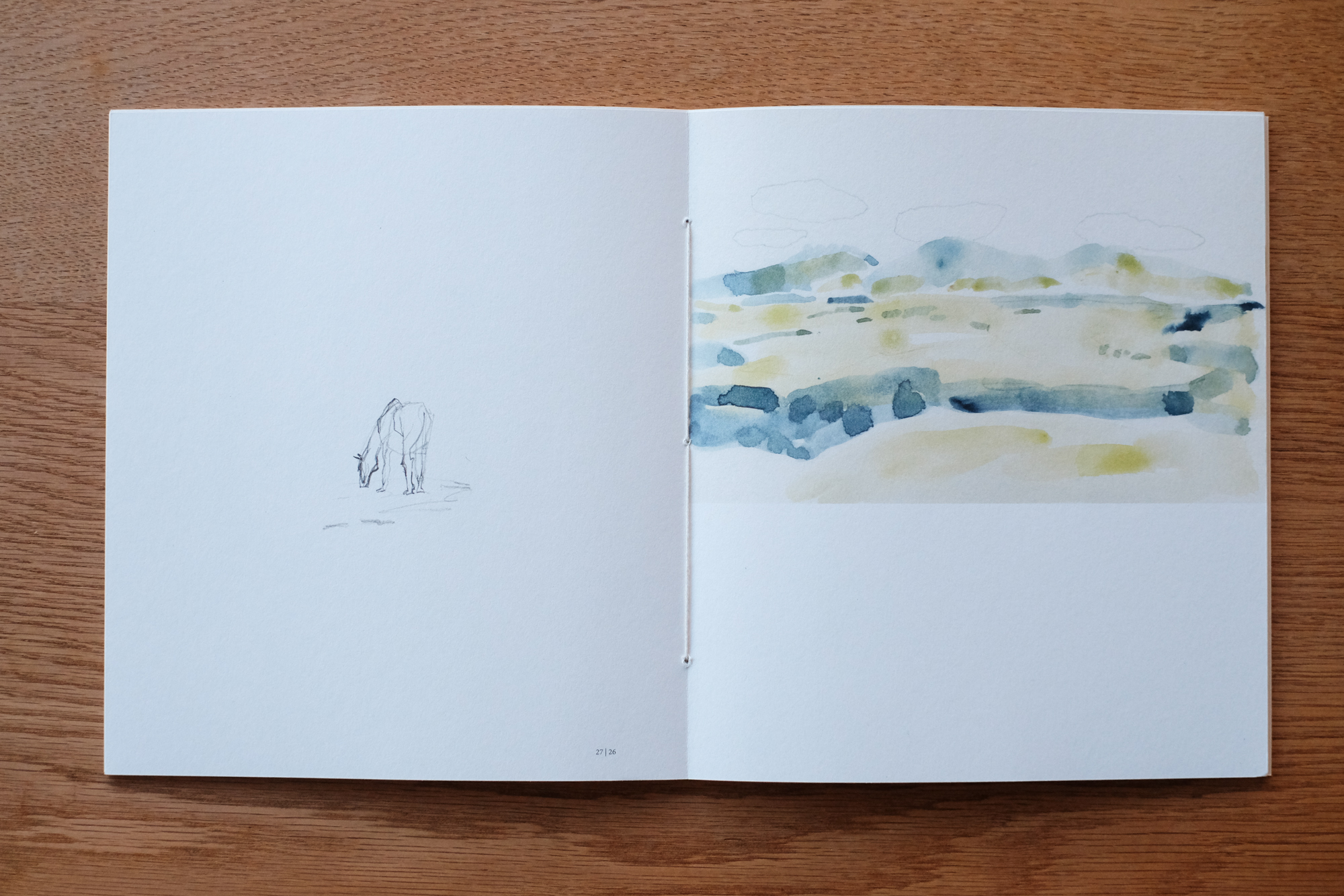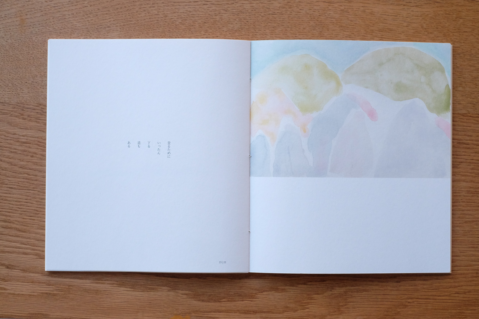 「Field notes(フィールドノート)」という言葉のとおり、現地で描き留められたスケッチが並ぶノートのように、久住・阿蘇の空気感をそのまま閉じ込めることを意識して制作しました。線画や水彩画、その場の空気をそのまま写し取ったような抽象画、作家自身の線で描かれた山々の稜線や地図など、多様な表現を収録しています。作品の合間には、雄大な自然と向き合う中で生まれた、作家自身による自由律俳句も数点収められています。